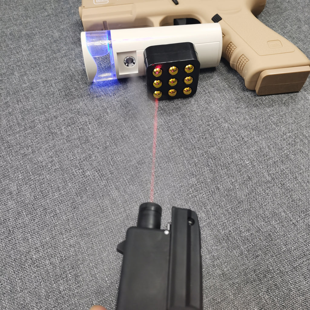 The slide moves back when you Press the trigger. At the same time, fire the laser and ejecting the shells.