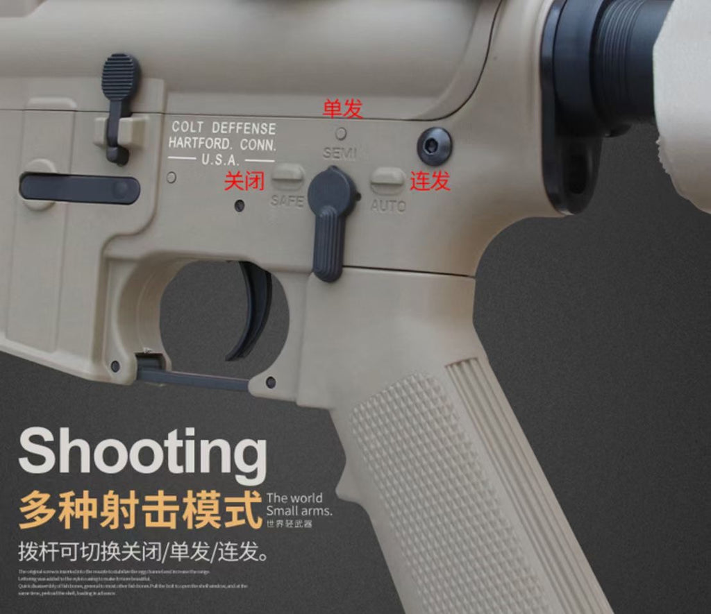 Load Gel Balls in the magazine, pull the charging handle, preload the bullet, and shoot. Shooting is divided into single shot mode and burst mode.